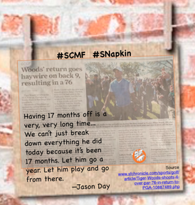 This just in… Tiger Woods come-back tour (er.. on The Tour) started on Thursday with a round at the Farmers Open in San Diego. The 76 is an indication that he is playing himself into shape. We commend him for getting out there and “re-learning” by doing.