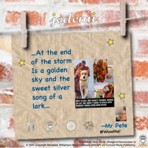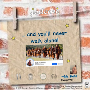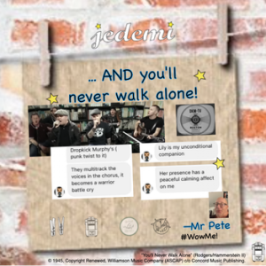 And me, being the music guy I am, it struck me like a V-8… the inspirational song “You’ll Never Walk Alone” fits perfectly!