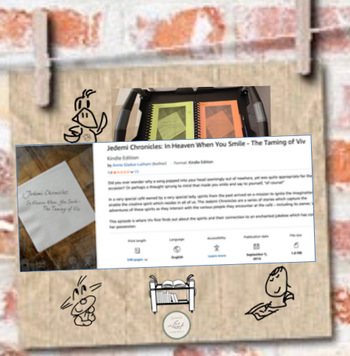 She studies the titles: JEDEMI CHRONICLES: THE TAMING OF VIV, JEDEMI CHRONICLES: THE TAMING OF THE SUIT.