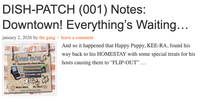 After catching up on his sleep, Happy Puppy Kee-Ra was bursting with energy fueled by what he experienced during his excursion DOWNTOWN. Chatting up a storm, former Suit (and current HOMESTAY HOST) Ms KATIE actively listened… making mental notes for the DISH-PATCH. Now it’s your turn to listen in. Enjoy! —The Gang