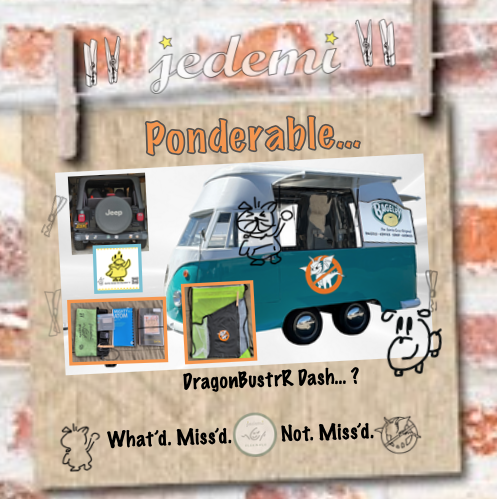 What I CAN tell you… is that MOBILE is in PLAY here… A sort of… DRAGONBUSTRs To-Go… An idea for facilitating TIME-OUTS by not only having a KIT like that POUCH and SATCHEL-PAK of yours, but also FOOD… Described as… “TRANSCENDENT” FOOD. At least, that’s what I think I read… NOT READ… over her shoulder.