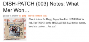 So far, they’ve been updates TO Kee-Ra’s human, MEREDITH. Now it’s Kee-Ra, the Happy Puppy’s update to LADY KATIE — while they are doing their CREEK TRAIL JAUNT. An Awakening perhaps? Read on! —The Gang