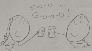 Kimba, without spilling a drop, produces a… MOCHA CHAI. Actually two. Tapping cups, they sip and let the YUM wash over them.