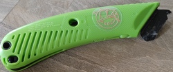 Katie laughs as she reaches in and shows her handy BOX CUTTER.