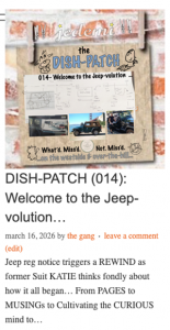 While hanging out doing the “SMOG THING”, RC has a nice chat with Happy Puppy KEE-RA — more storytelling related to former Suit, Katie’s various Jeeps and her Journey. Let’s listen in… —The Gang