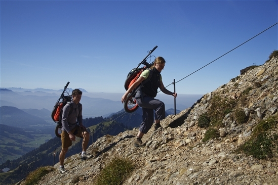 The design of the bike is really conducive to safe downhill riding. If the terrain is really rough, you can stand on the Bergmönch with your weight well back. Otherwise you can ride kneeling, with relaxed muscles for the descent. They say the riding position, upright, low and set well back to the rear, and the different-sized wheels, all create a well thought concept, which ensures superb handling and safety downhill, while achieving a perfect compromise between compactness in uphill mode and comfort downhill.