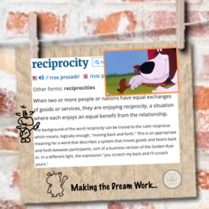 Reciprocity! Right! … The bone. The fish. The cheese… A cooperative effort!