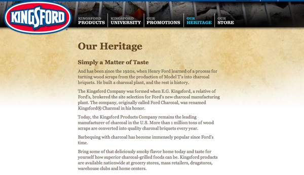 Apparently Mr. Ford had a relative named E.G. Kingsford who brokered the site selection for a new charcoal manufacturing plant that Mr. Ford wanted built. The company producing the briquets was originally called Ford Charcoal, it was renamed Kingsford® Charcoal to honor Mr. Ford’s relative.