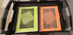 Making her way over to the cart, she studies the contents on top as the comb-bound documents draw her eyes. And on cue, owner Nicole zips by again.