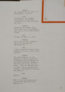 She points to the JOURNAL. It’s in there. Just wrote about it and then THUNK, you drop the DRAFT onto the table.